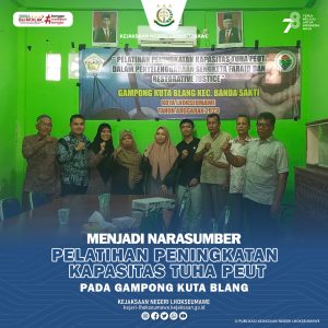 Jaksa Fungsional Pada Kejaksaan Negeri Lhokseumawe Reny Widayanti, S.H di dampingi Ramario Haqri, S.H menjadi Narasumber Pada Kegiatan Pelatihan Peningkatan Kapasitas Tuha Peut dalam Penyelenggaraan Sangketa Faraid dan Restorative Justice di Gampong Kuta Blang Lhokseumawe. Minggu, 17/12/2023