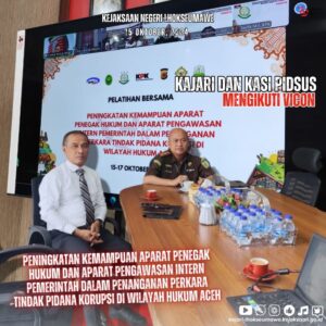 Kepala Kejaksaan Negeri Lhokseumawe Bapak Feri Mupahir, S.H.,M.H dan Kepala Seksi Tindak Pidana Khusus pada Kejaksaan Negeri Lhokseumawe Edwardo, S.H.,M.H mengikuti Vicon Peningkatan Kemampuan Aparat Penegak Hukum dan Aparat Pengawasan Intern Pemerintah dalam Penanganan Perkara Tindak Pidana Korupsi di Wilayah Hukum Aceh. Selasa, 15/10/2024