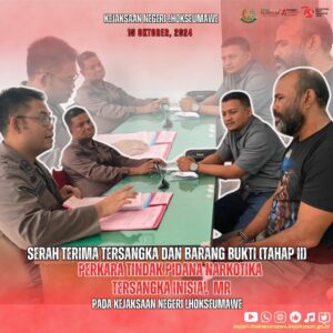 JPU pada Kejaksaan Negeri Lhokseumawe Abdi Fikri, S.H.,M.H Telah Menerima Tanggungjawab Tersangka dan Barang Bukti (Tahap II) yang melanggar Kesatu Primair Pasal 114 Ayat (2) Undang-Undang Republik Indonesia Nomor 35 Tahun 2009 Tentang Narkotika Subsidair Pasal 112 Ayat (2) Undang-Undang Republik Indonesia Nomor 35 Tahun 2009 Tentang Narkotika dan Kedua Pasal 111 Ayat (1) Undang-Undang Republik Indonesia Nomor 35 Tahun 2009 Tentang Narkotika An.Tersangka Inisial MR Terhadap Tersangka Dilakukan Penahanan Di Lapas Kelas II A Lhokseumawe. Kamis, 10 Oktober 2024