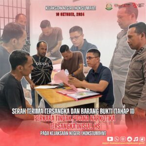JPU pada Kejaksaan Negeri Lhokseumawe Muhammad Syafrizal Amri, S.H. Telah Menerima Tanggungjawab Tersangka dan Barang Bukti (Tahap II) yang melanggar Pertama Pasal 114 Ayat (1) Undang-Undang Republik Indonesia Nomor 35 Tahun 2009 Tentang Narkotika Atau Kedua Pasal 112 Ayat (1) Undang-Undang Republik Indonesia Nomor 35 Tahun 2009 Tentang Narkotika An.Tersangka Inisial HS Terhadap Tersangka Dilakukan Penahanan Di Lapas Kelas II A Lhokseumawe.