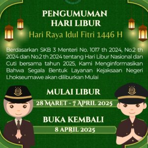 Berdasarkan SKB 3 Menteri No. 1017 th 2024, No.2 th 2024 dan No.2 th 2024 tentang Hari Libur Nasional dan Cuti bersama tahun 2025, Kami Menginformasikan Bahwa Segala Bentuk Layanan Kejaksaan Negeri Lhokseumawe akan diliburkan Mulai :