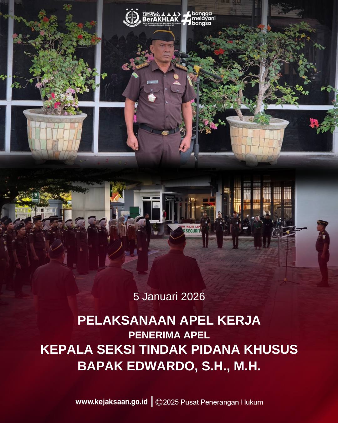 Pada Hari Senin, tanggal 5 Januari 2026, Kepala Seksi Tindak Pidana Khusus Bapak Edwardo, S.H., M.H. menjadi Penerima Apel Kerja yang diikuti oleh seluruh pegawai Kejaksaan Negeri Lhokseumawe.