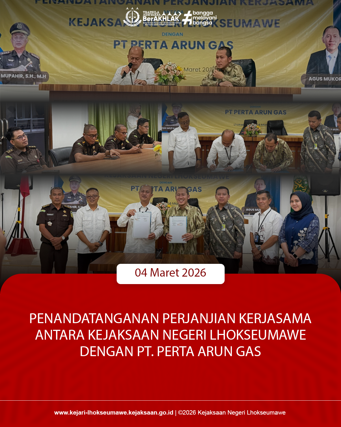 Kepala Kejaksaan Negeri Lhokseumawe Bapak Feri Mupahir, S.H., M.H beserta Para Kasi dalam Bidang Perdata dan Tata Usaha Negara Melaksanakan Penandatanganan Perjanjian Kerjasama dengan PT. Perta Arun Gas yang diwakili oleh Bapak Agus Mukorobin sebagai Technical & Operation Director