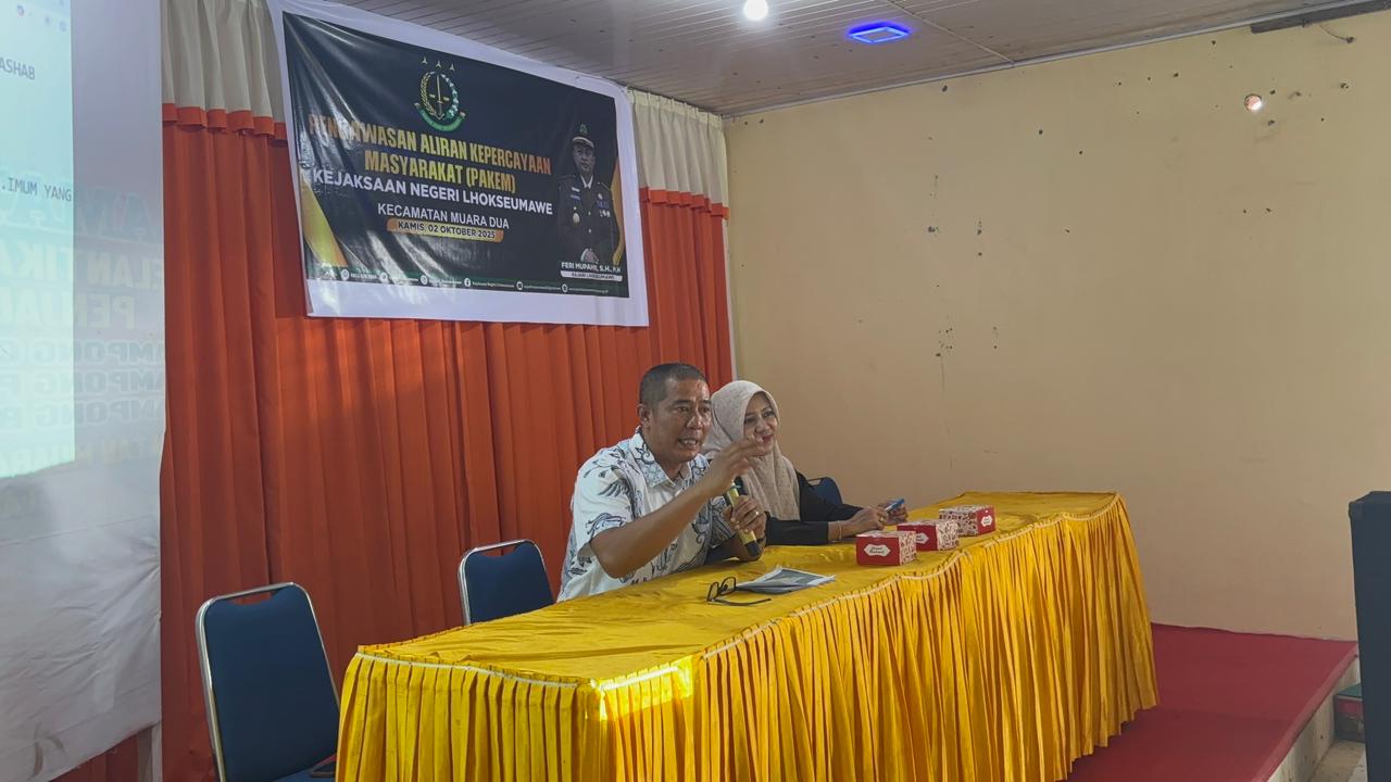Lhokseumawe – Kejaksaan Negeri (Kejari) Lhokseumawe melalui Seksi Intelijen melaksanakan kegiatan Pengawasan Aliran Kepercayaan Masyarakat (PAKEM) di Kecamatan Muara Dua, Kota Lhokseumawe, Kamis (2/10/2025). Kegiatan yang berlangsung di Aula Serbaguna Kantor Camat Muara Dua ini dihadiri sekitar 50 peserta yang terdiri dari unsur pemerintah kecamatan, Forum Geuchik, Tuha Peut, serta para Tgk. Imum Gampong.